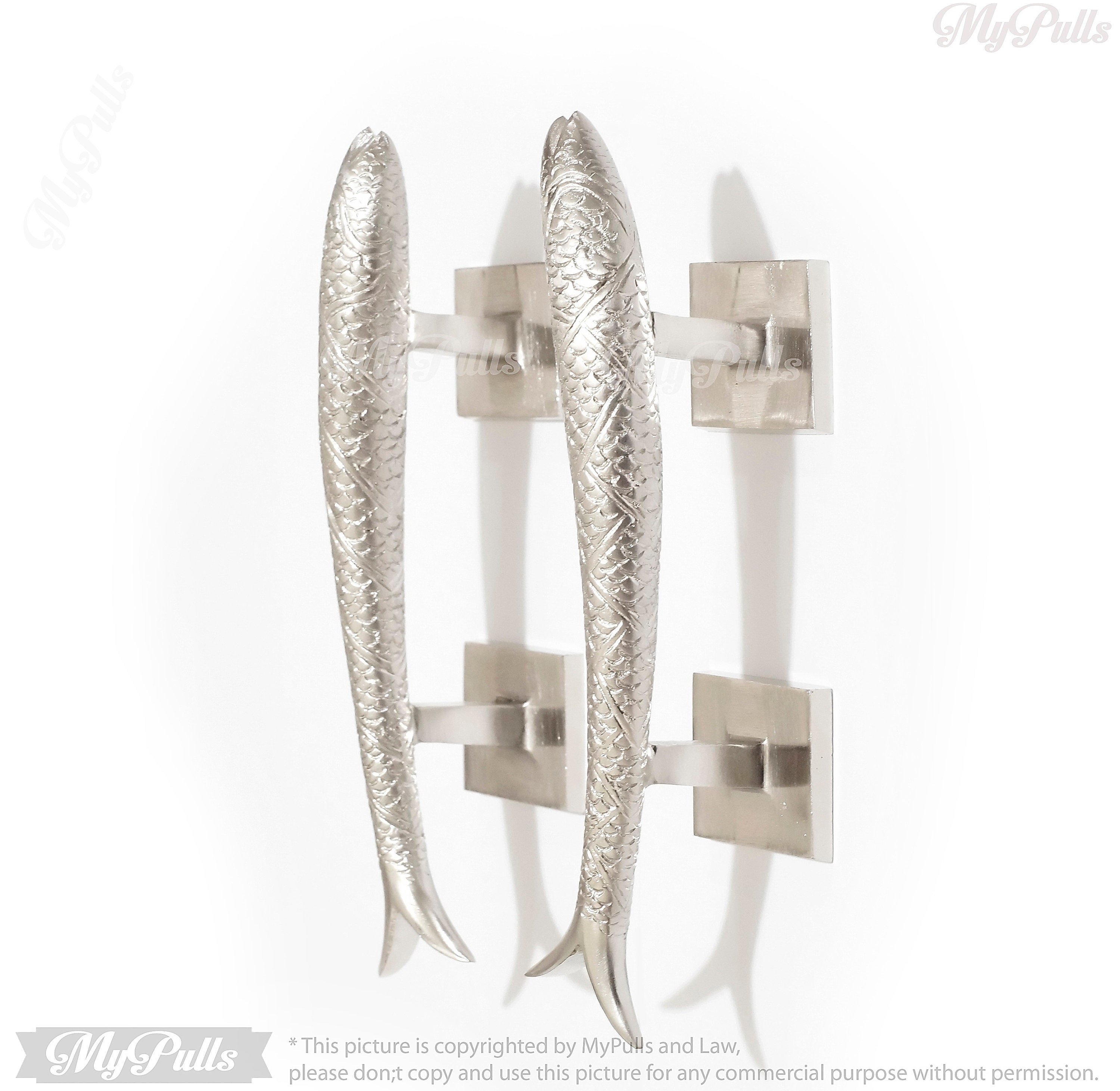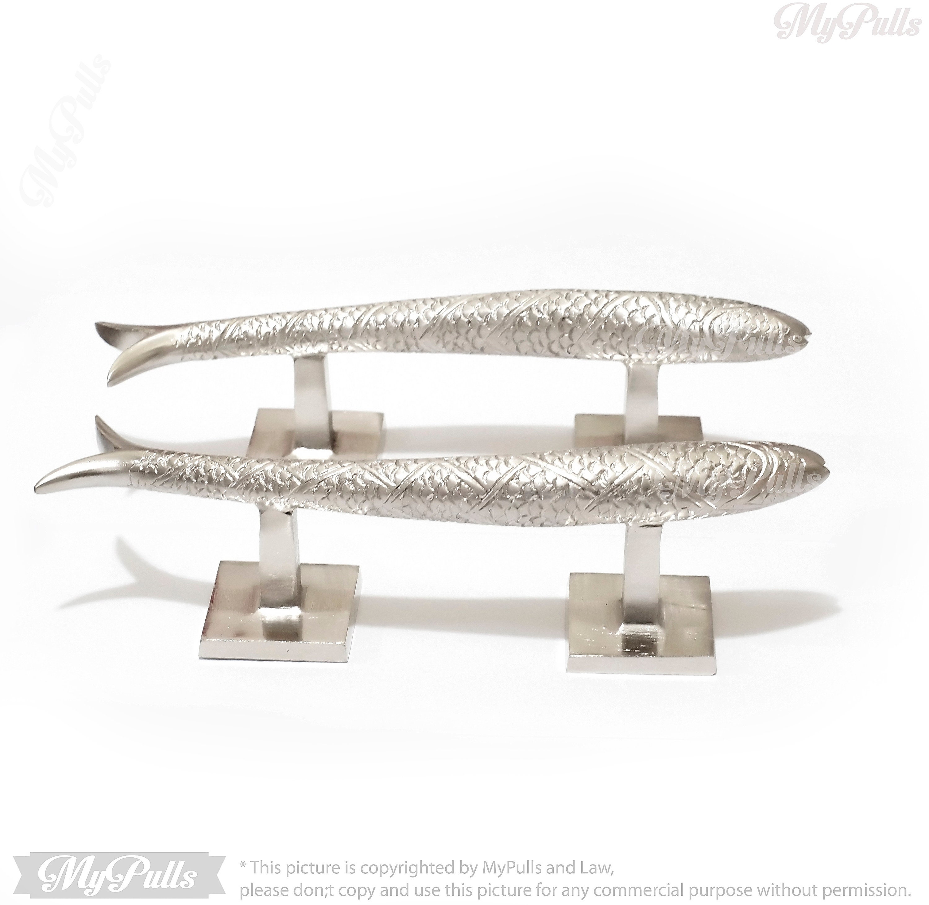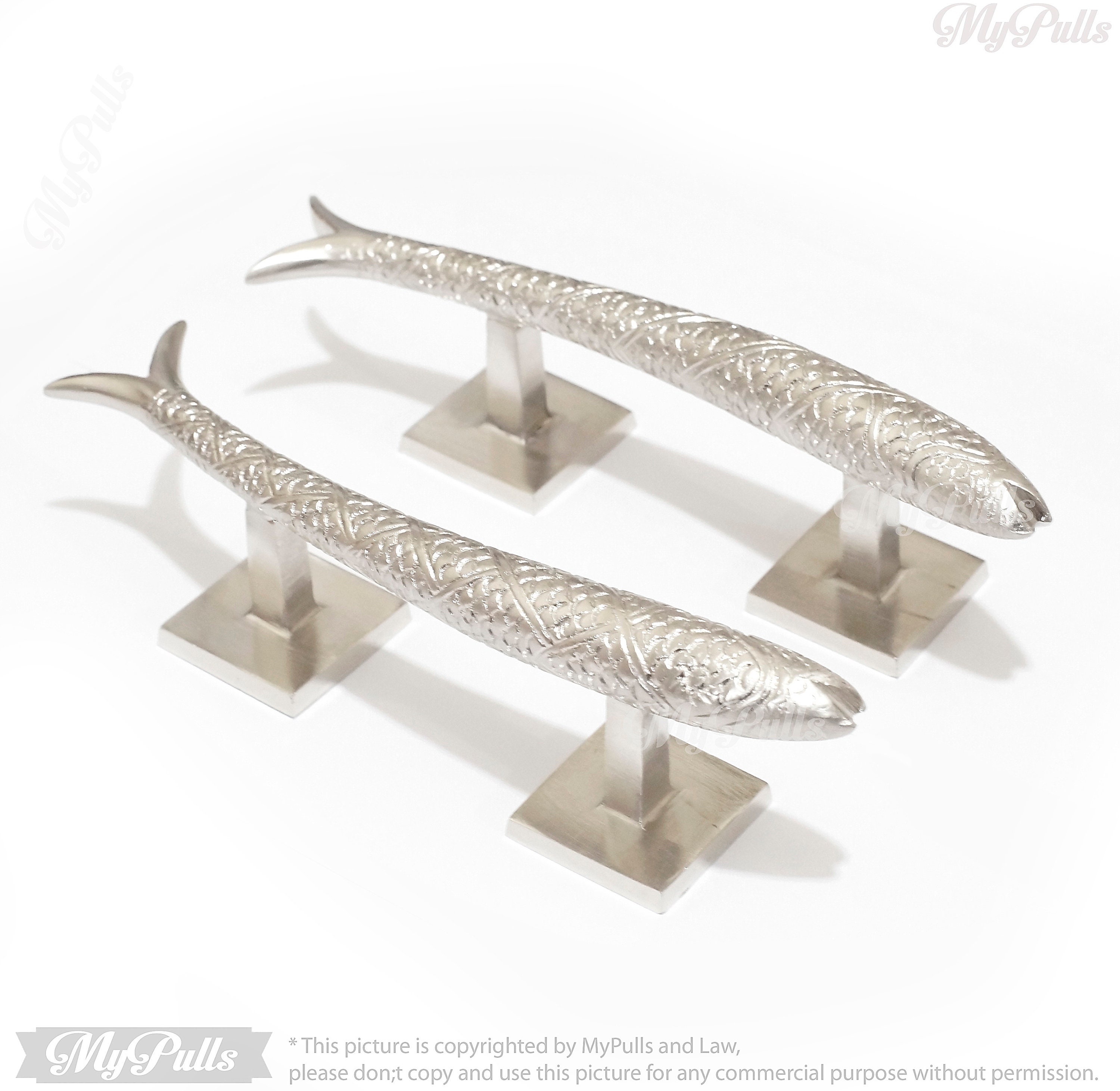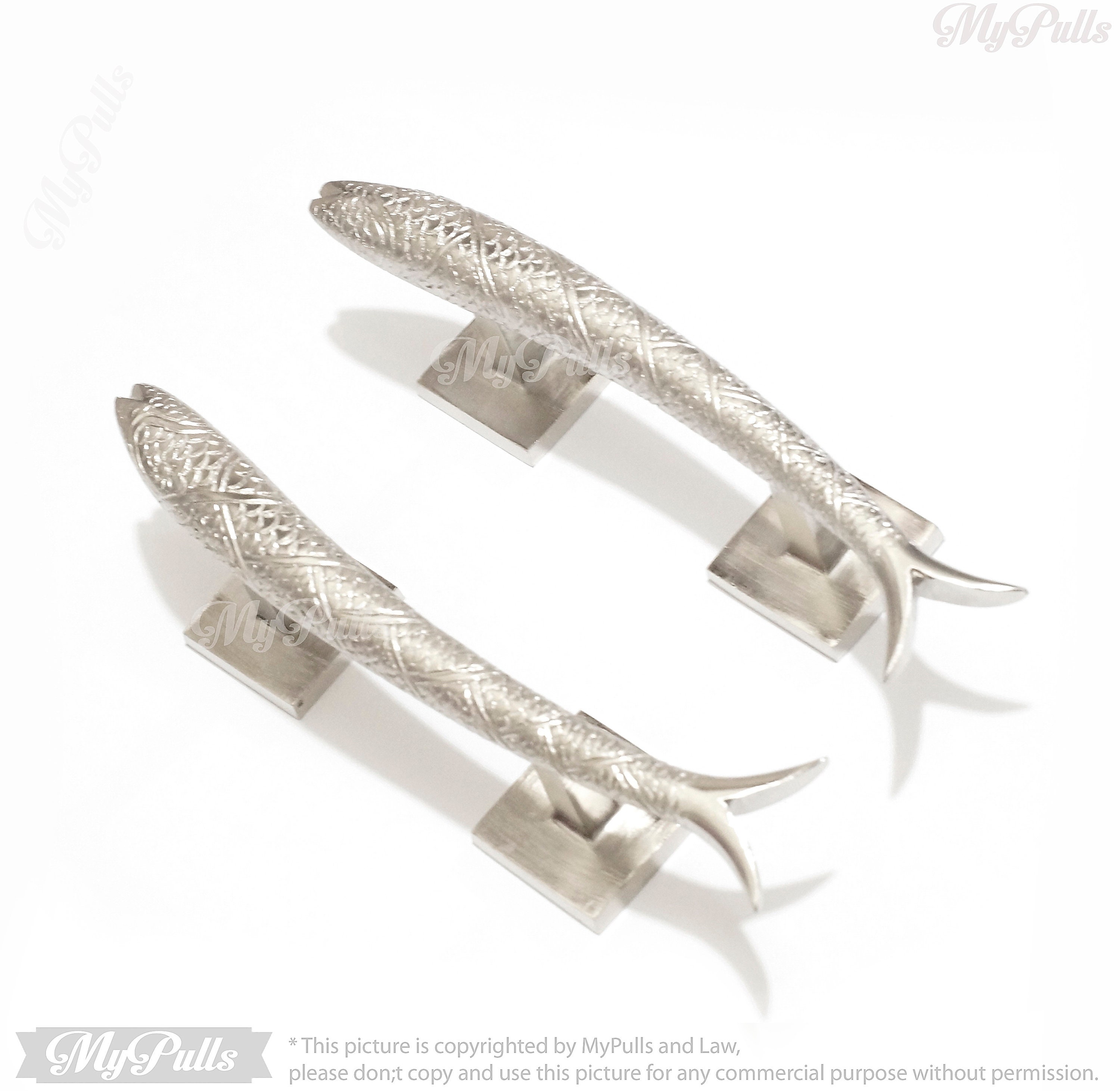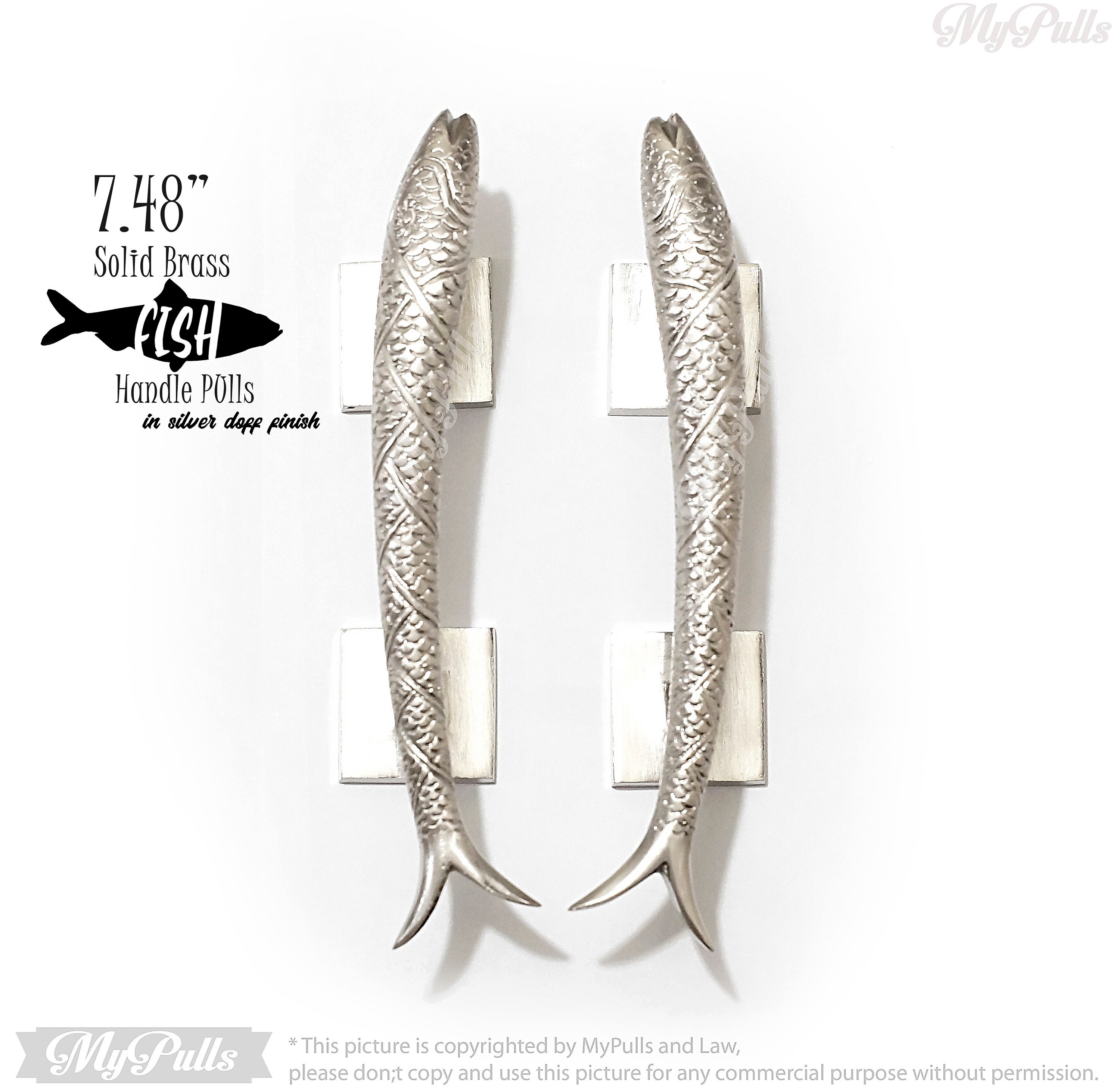 7.48" inches Pair Solid Brass Retro Fish Pull Silver Doff finish | Solid Brass Fish Animal Cabinet Drawer Dresser Kitchen Door knob Handles