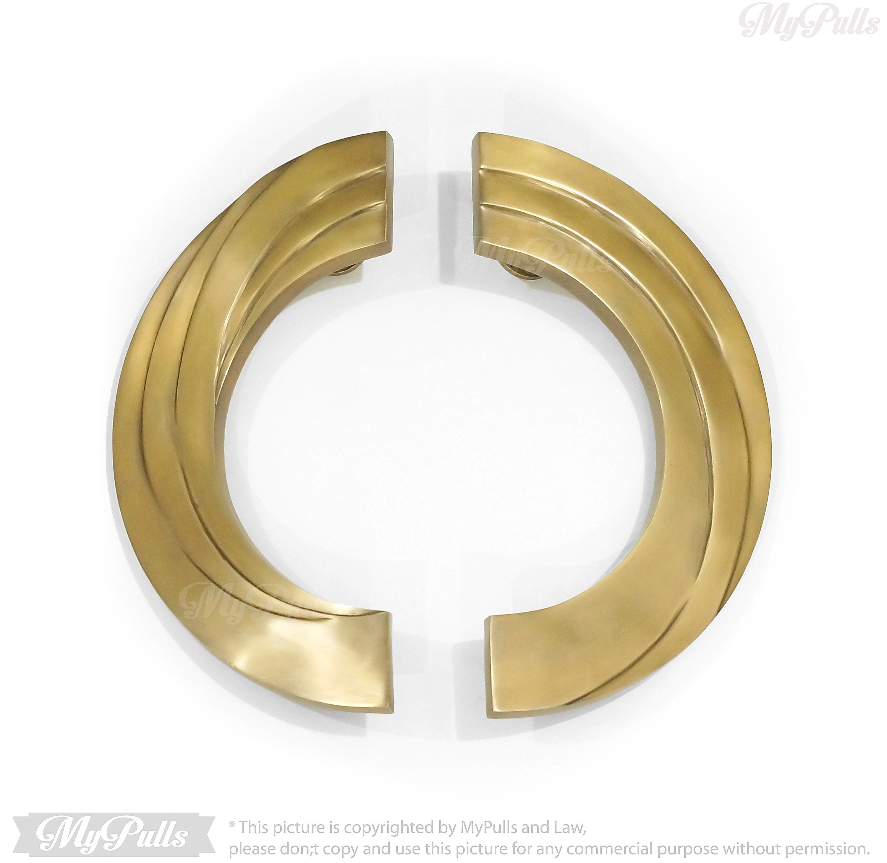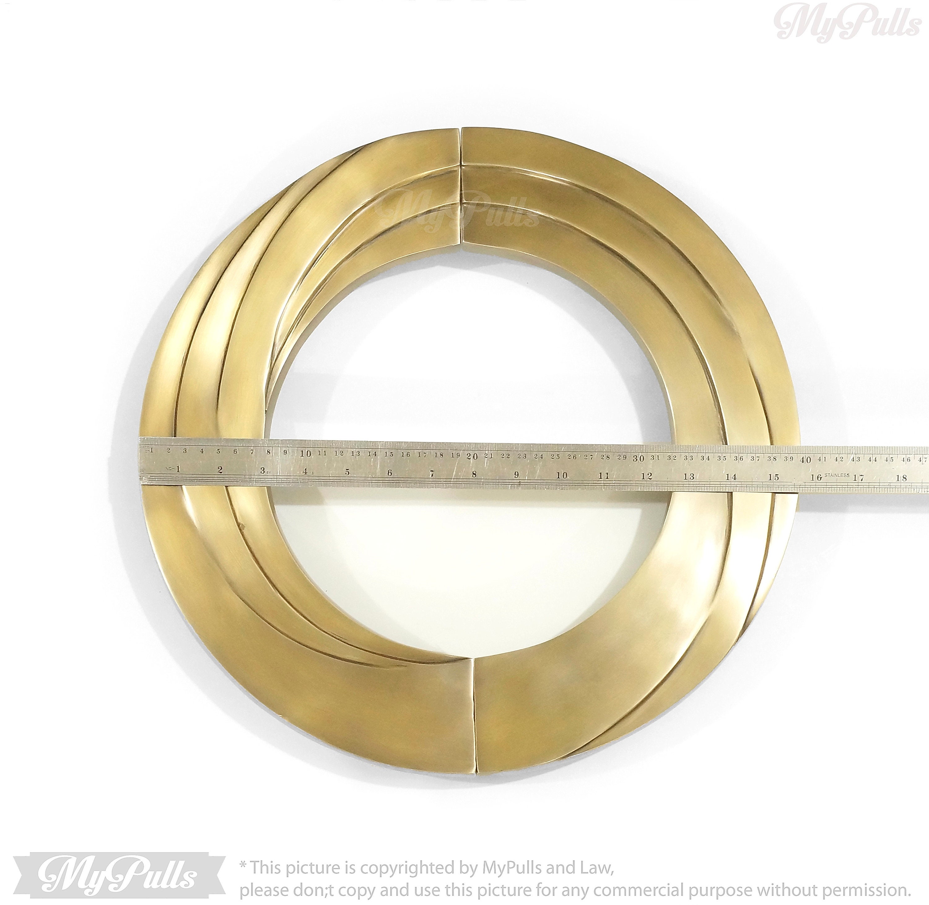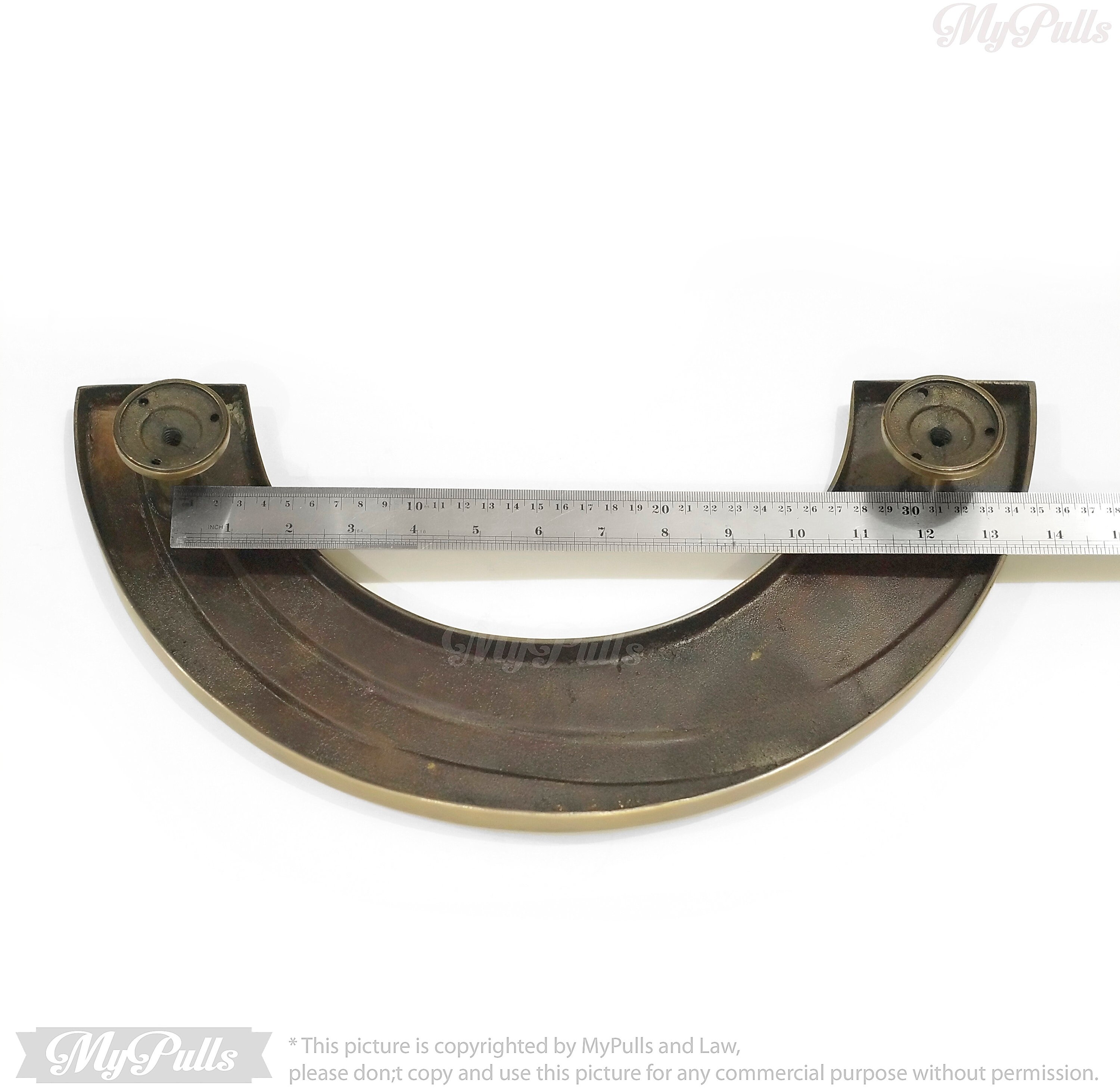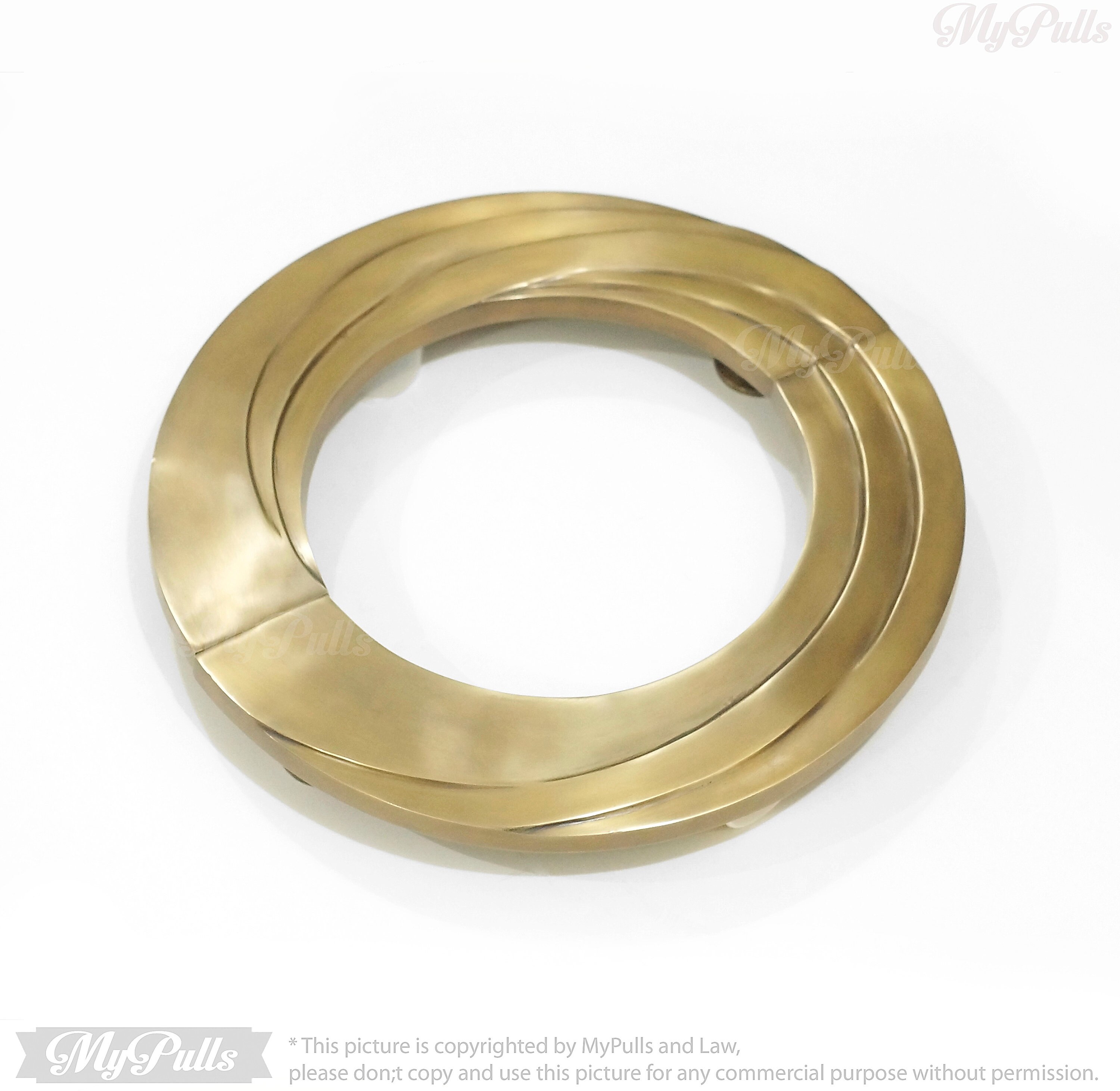 The "Large Vintage Brass Retro Swirl Round Entry Front Door Handle Pulls - 16.00" inches", These door handle pulls are a perfect blend of vintage charm and retro aesthetics, designed to enhance the look of your front door or entryway.