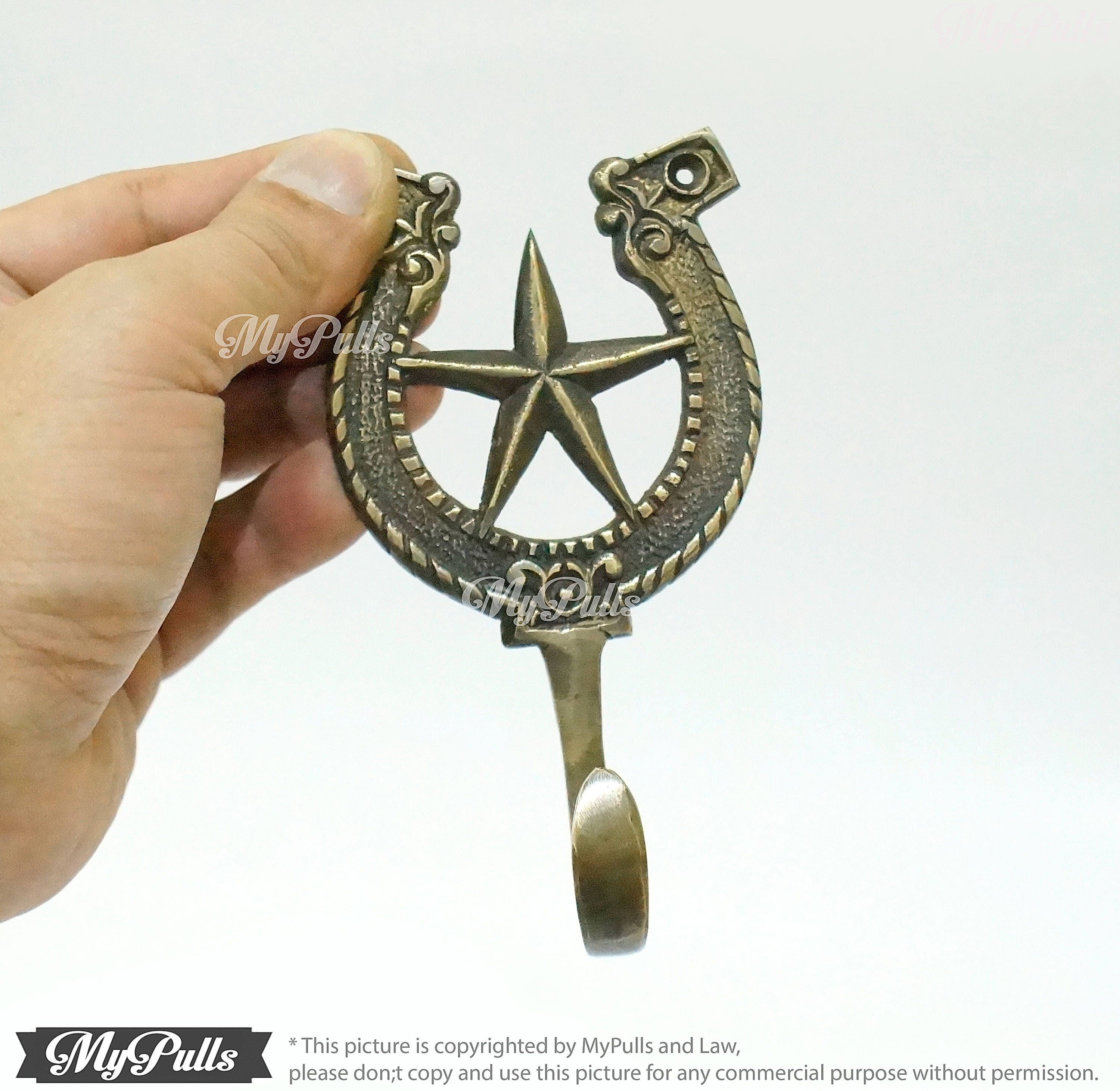 5.43" inches Solid Brass Horseshoe Bay Hook with Cowboy Star Medal wall hook | Strong Wall Mount Coat Hat Hook - Texas Cowboy series